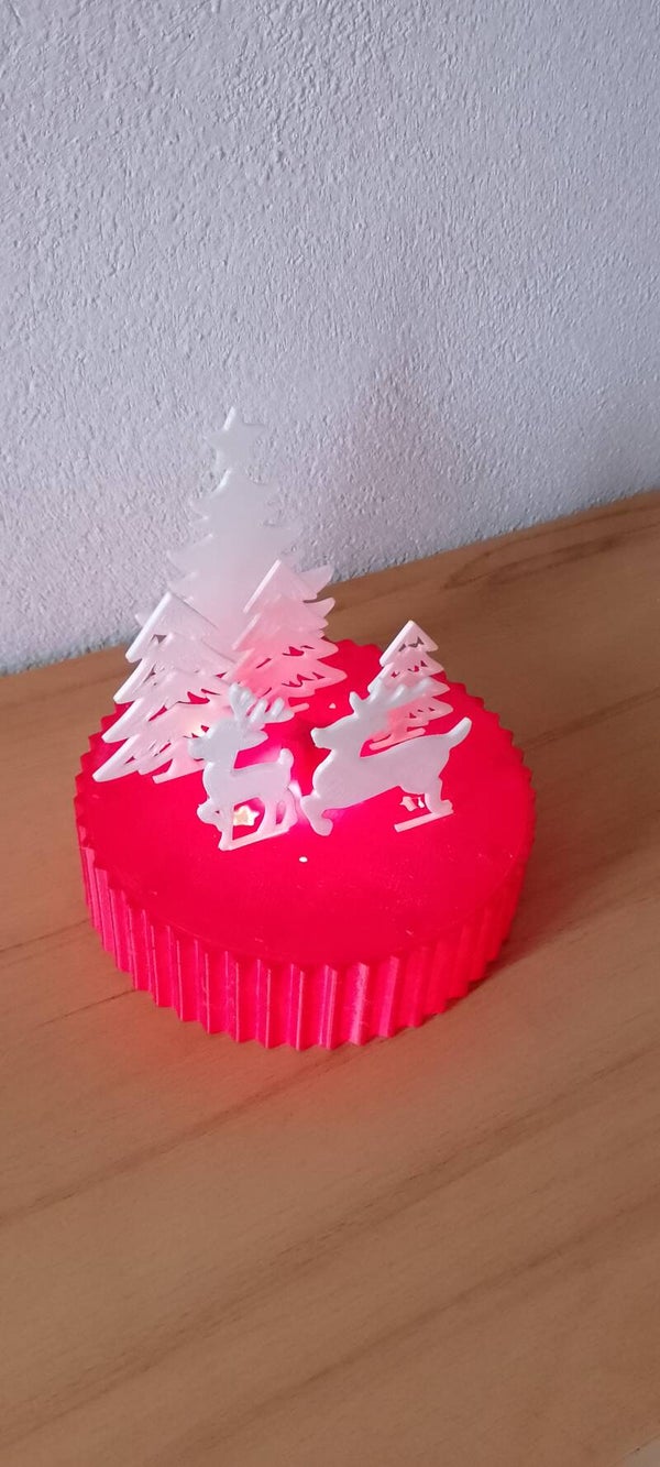 Weiße Silhouetten von Tannenbäumen und Rentieren schaffen eine märchenhafte Winterlandschaft